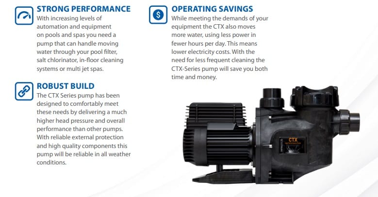 The AstralPool CTX pump has been designed to comfortably meet the needs and pressures required by your swimming pool and spa equipment. Made from high quality materials and components the CTX is designed to produce greater efficiency and reduce noise levels. Suitable for in-floor cleaning systems, spa jets and other demanding applications the CTX will provide a high performance and reliability.