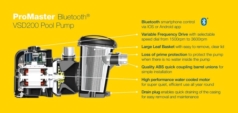 - Full Variable Speed Control – The ProMaster offers the pool owner and operator total control over the speed at which the pump needs to operate, from 1,500rpm to 3,600rpm Energy Efficiency – 8 Star energy rating offering up to 70% lower energy use than a traditional fixed speed 1hp pump*